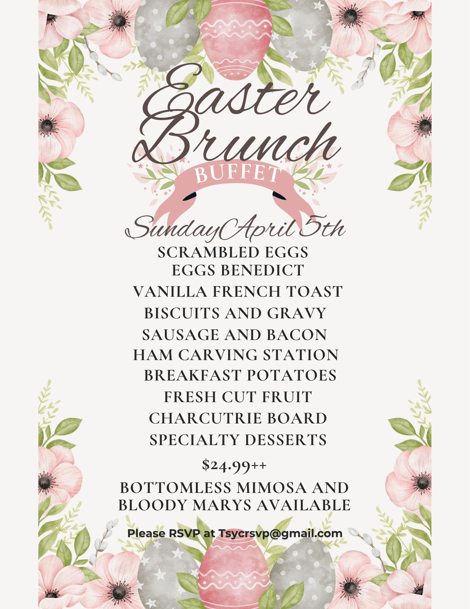 Back to All Events Easter Brunch Sunday, April 5, 2026 10:00 AM 2:00 PM Google Calendar ICS RSVP here!